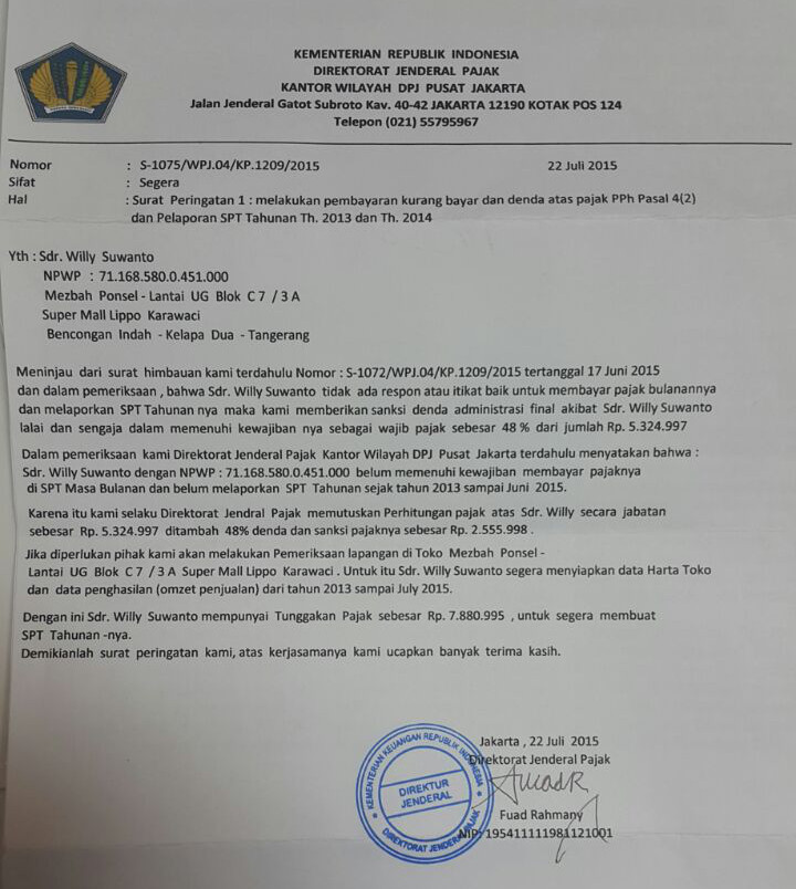 Sepintas lalu, surat ini tampak asli dan legal. Apalagi jika surat diterima di daerah pelosok dengan jaringan komunikasi kurang. Namun jika penerima surat cukup jeli, setidaknya terdapat banyak kejanggalan dalam surat tersebut. Simak misalnya alamat kantor pajak yang menggunakan kotak pos 124. Kemudian nama unit kerja yang tidak benar “Kantor Wilayah DPJ Pusat Jakarta” hingga penandatangan surat yang jelas-jelas keliru yang mana Direktur Jenderal Pajak yang menjabat pada tanggal 22 Juli 2015 bukanlah Fuad Rahmany. Setidaknya terdapat sepuluh kekeliruan dalam surat tersebut, silakan Anda pelajari.