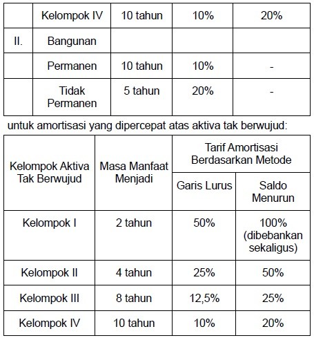 - Penyusutan dan amortisasi aktiva dipercepat sebagaimana pada tabel berikut: