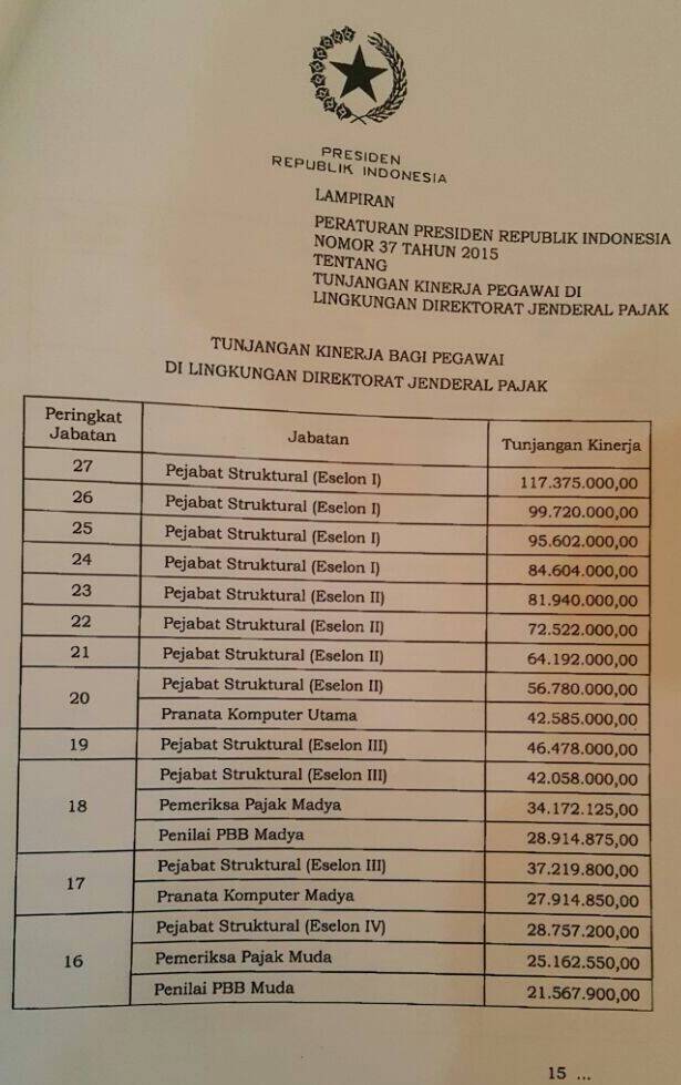 Forum Pajak – Janji Presiden Jokowi untuk memberi vitamin pada pegawai pajak akhirnya terealisasi. Vitamin atau biasa disebut kenaikan tunjangan kinerja pegawai Direktorat Jenderal Pajak tersebut dimuat dalam Peraturan Presiden (Perpres) Nomor 37 Tahun 2015.