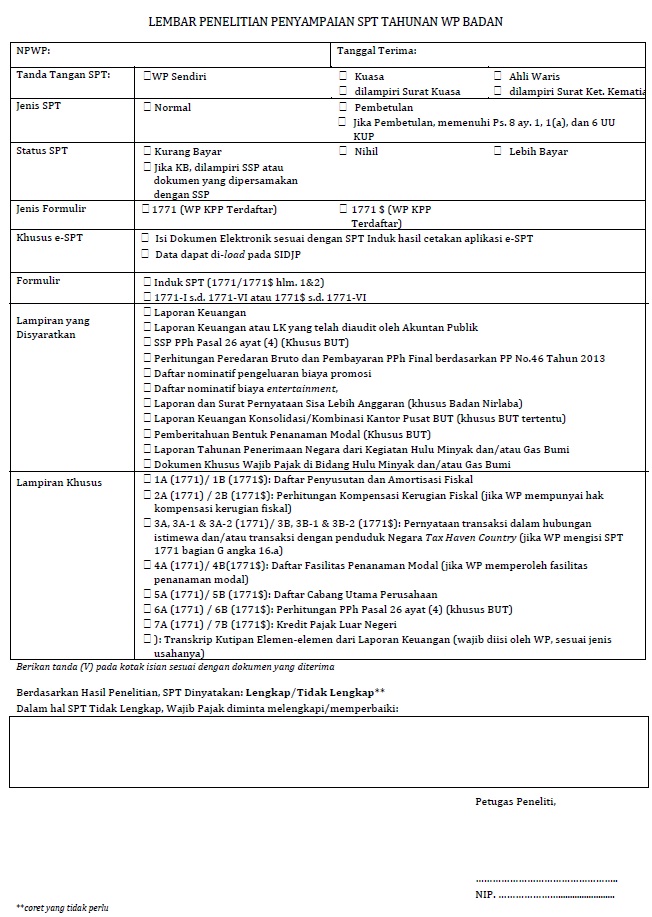 - SPT Tahunan tidak atau kurang disertai dengan Lampiran pada Formulir atau Lampiran Keterangan dan/atau Dokumen yang Disyaratkan;