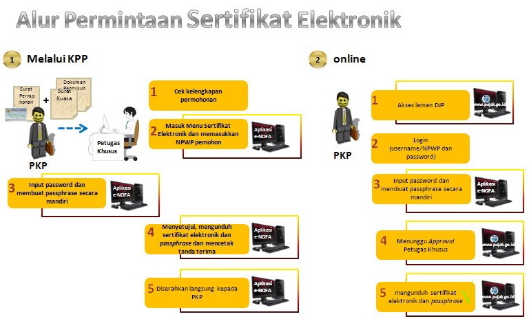 - Secara offline (Untuk PKP Badan silakan baca Permohonan Sertifikat Elektronik Pajak, sedangkan untuk PKP Perorangan silakan baca Permohonan Sertifikat Elektronik Pajak bagi PKP Perorangan)